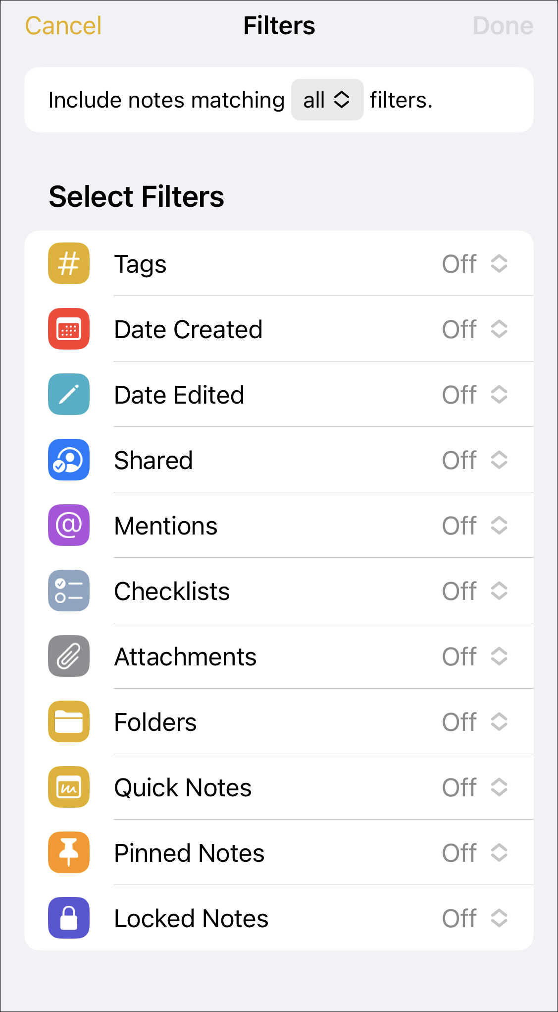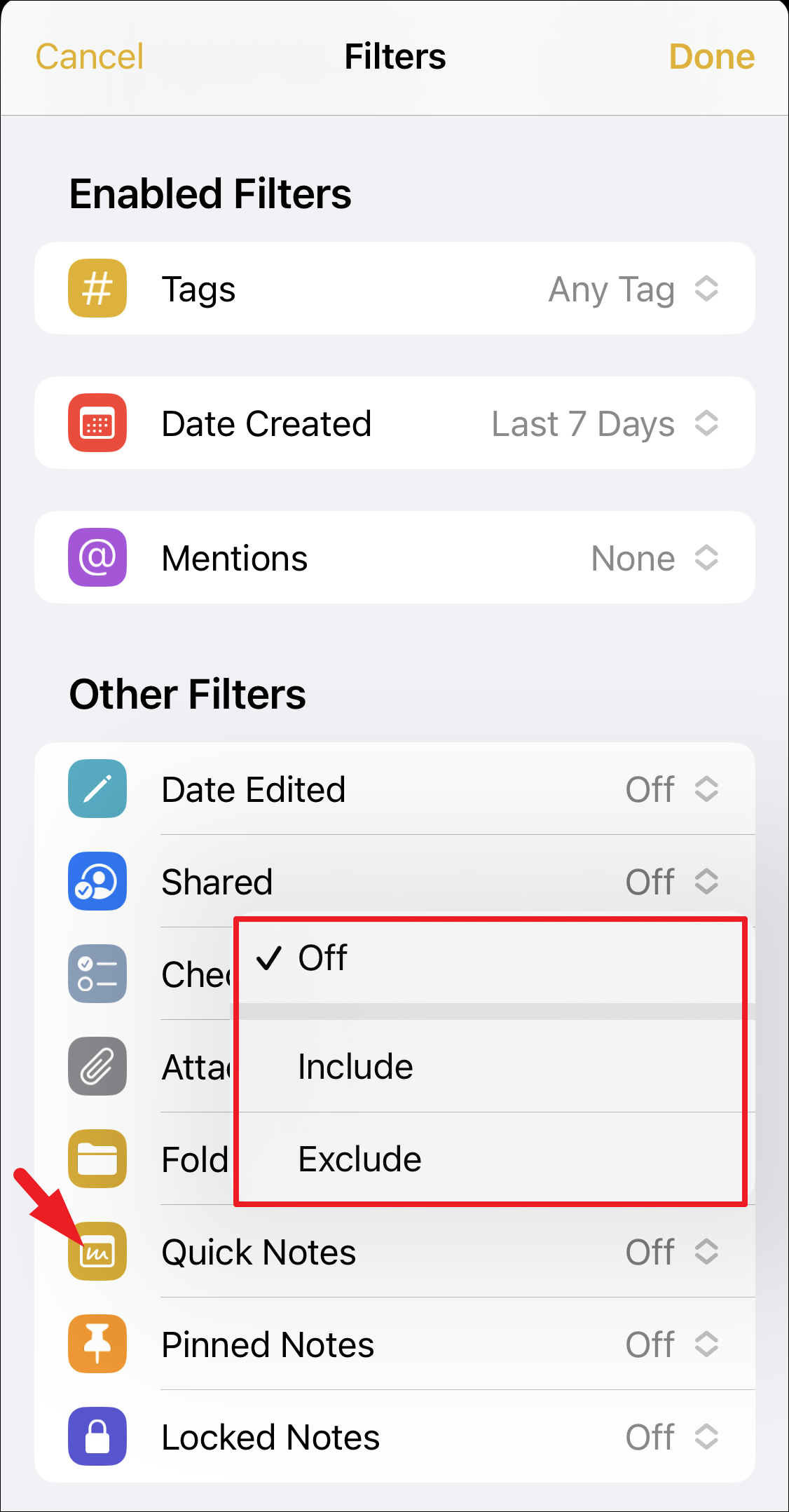 There are other filters as well, that you can configure according to you requirements and preferences such as you can include Pinned Notes, Quick Notes, Locked Notes, etc. Though the options for each filter may vary, the basic principle remains the same that is either to exclude or include a particular set of notes.