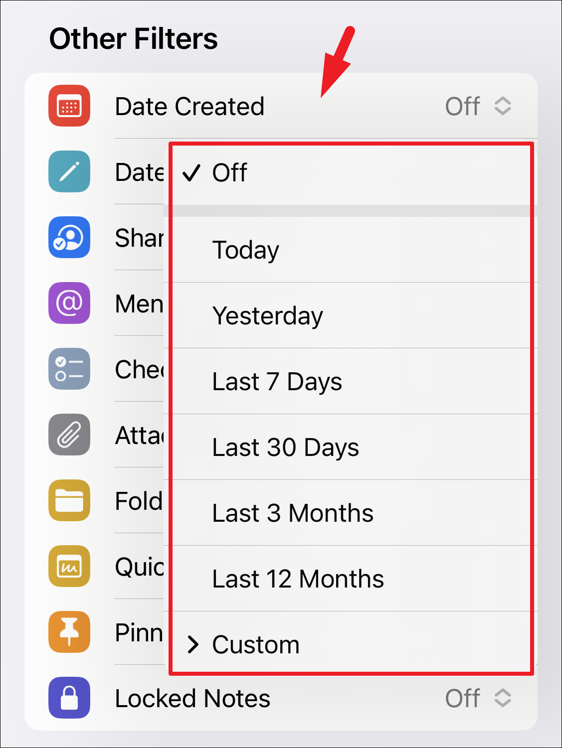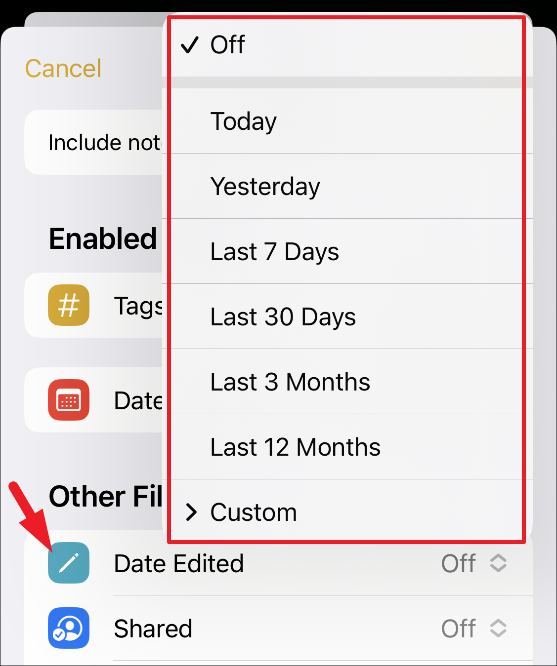 Similarly, you can also set a filter to include notes edited in a predefined date range or define a particular date/ date range by tapping on the ‘Custom’ option.