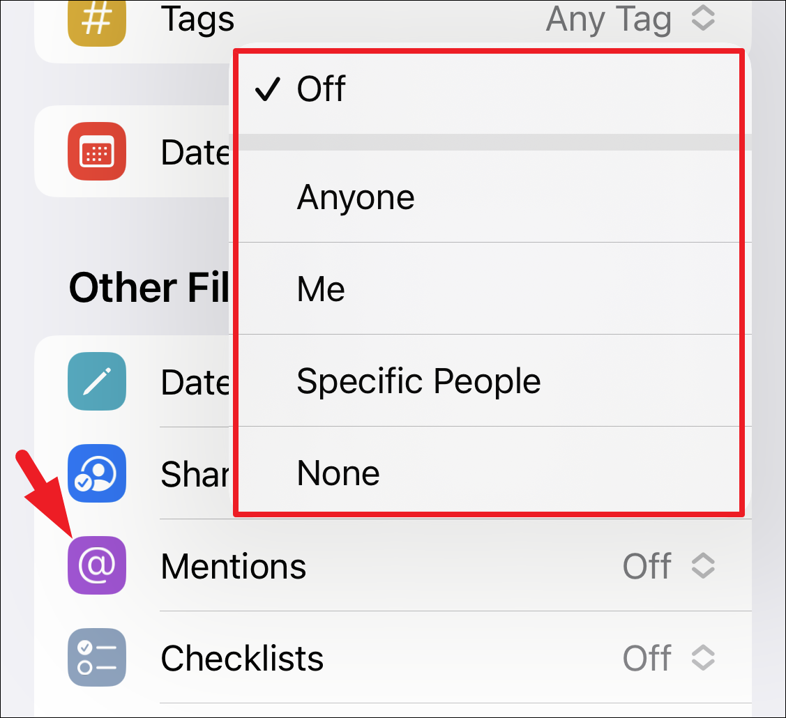 Similar to that, you can also include notes based on the contacts you have mentioned in the notes. To do that, tap on the ‘Mentions’ tab and select the required option. You can either select to include notes that have ‘Anyone’ mentioned, the ones that mention you, or specific people selected by you. Otherwise, you can also filter notes that do not mention anyone.