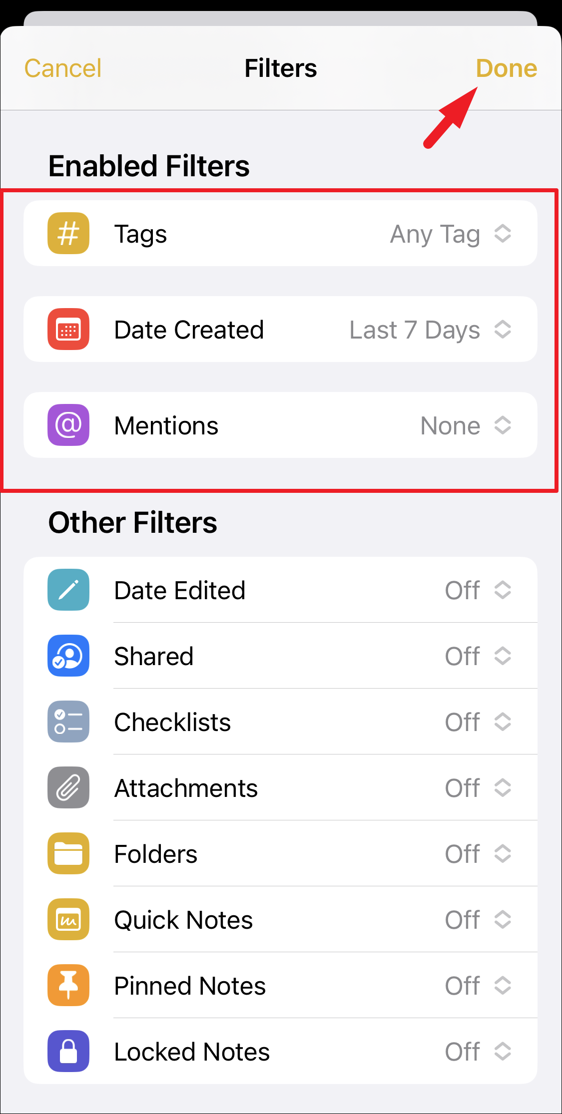You can use one or more filters in combination to create a folder based on the rules defined by you. All the selected filters will appear under the ‘Enabled Filters’ category for a smart folder. Once configured, tap on the ‘Done’ button to create the smart folder.