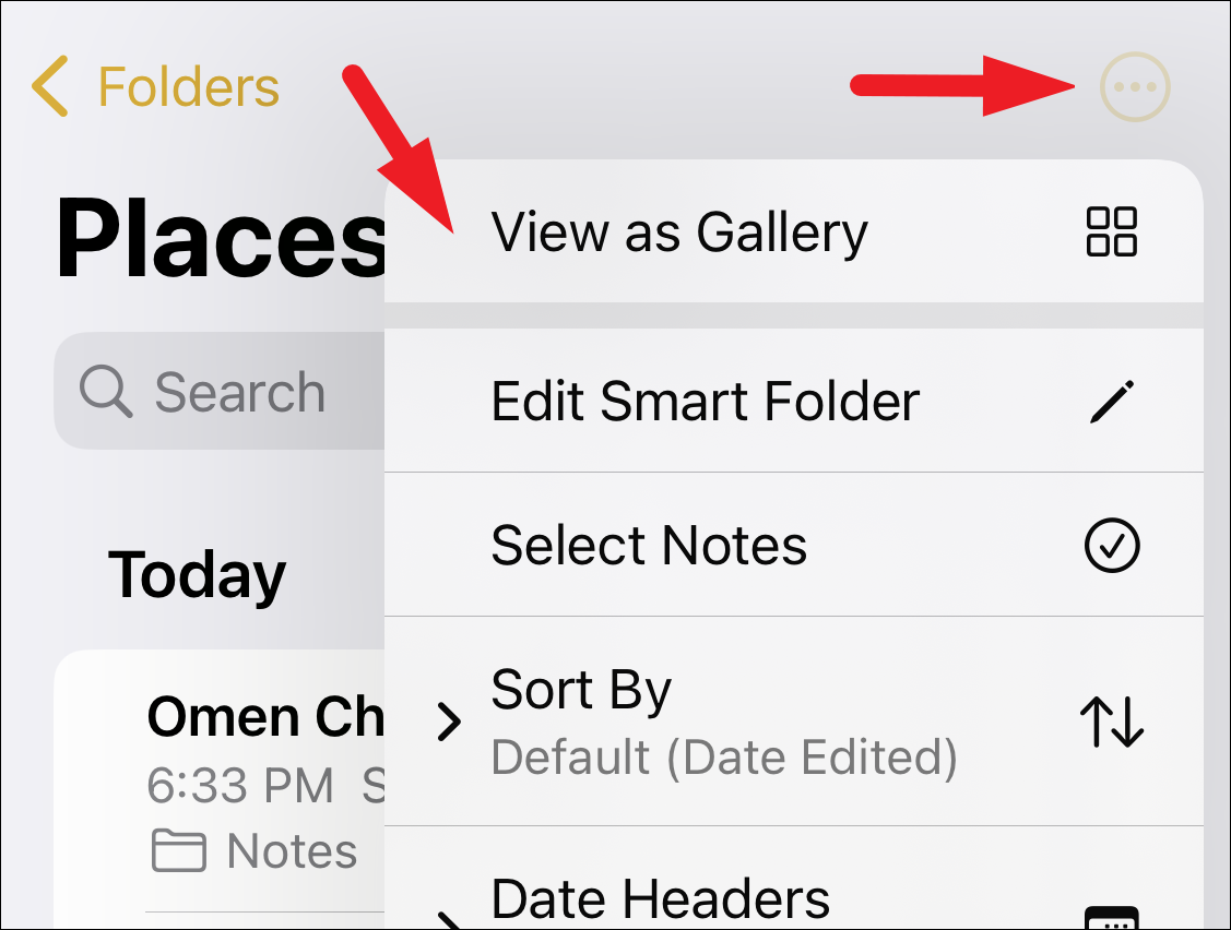To view the thumbnail of notes instead of a list, tap on the ‘More Options’ button (ellipsis icon) and then tap on the ‘View as Gallery’ option.