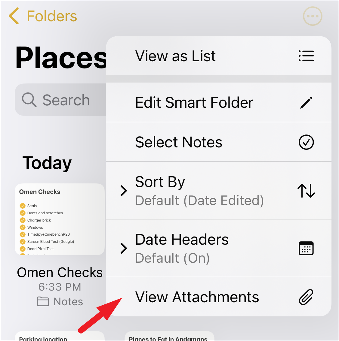 To view all the attachments of all the notes together, tap on the ‘View Attachments’ option from the ‘More Options’ menu. This will bring an overlay window to your screen.