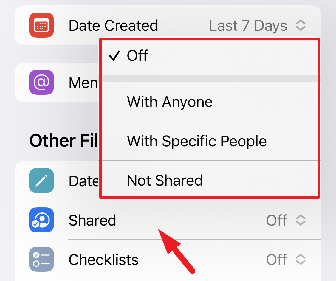 Then if you wish to create a filter based on with whom you have shared the note, tap on the ‘Shared’ tab and then select your preferred option.