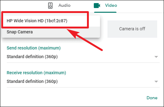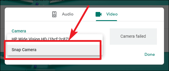 From the video settings screen, click on the drop-down menu under ‘Camera’ and select ‘Snap Camera’ from the available devices. Then, click on ‘Done’.