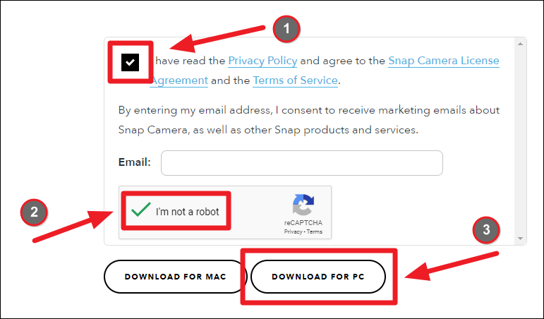 Snapchat requires you to accept the ‘Snap Camera License Agreement’ to be able to download the installer file. So go though the agreement, then tick the checkbox for ‘I have read the Privacy…’ and verify that you’re human on the reCAPTCHA box, then finally, click the download link to get the Snap Camera installer for your computer. No need to enter the Email address, it’s optional.