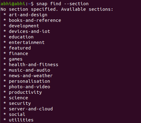 Snap organizes packages in sections, like games, finance, etc. User can search for packages in a particular section.