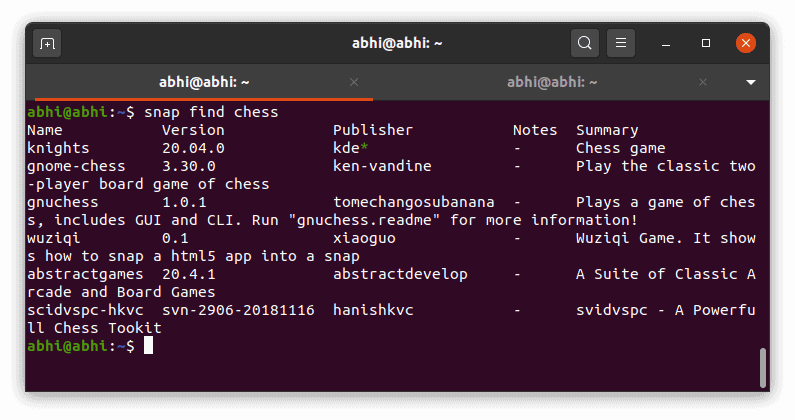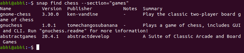 We can use the find command in snap to search for packages based on keywords. We can also use the alias for this command, search. Snap will search for the keyword not only in the package name but also in the description of the package.