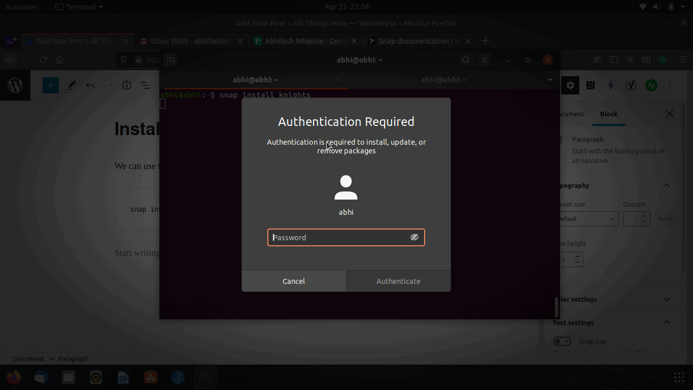 The user needs to have sudo privileges to install a package from Snap. Enter your password when prompted.