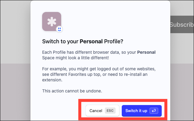 - Confirm that you want to move the Space to the new Profile by clicking on 'Switch it up'; you'll need to set up some things, like adding Favorites, logging into websites, and even installing extensions after moving your Space to the new Profile. If you want, you can also not move any Spaces currently; click on 'Cancel' and an empty Profile will be created.