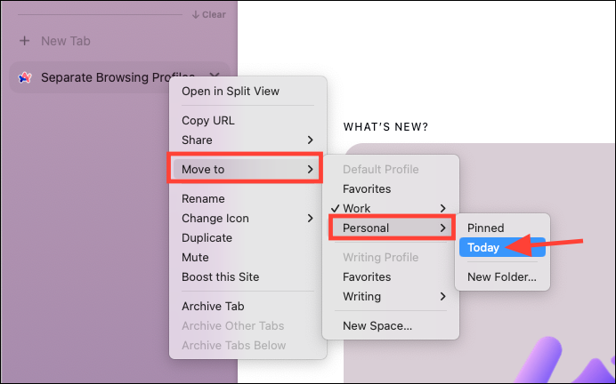 - If, at any point, you think that a link belongs in another Space, it's easy to move it there. Right-click on the link and go to 'Move to'. Then, go to the 'Space name' you want to move it to and select whether you want to move it to the 'Pinned' section or 'Today' section.