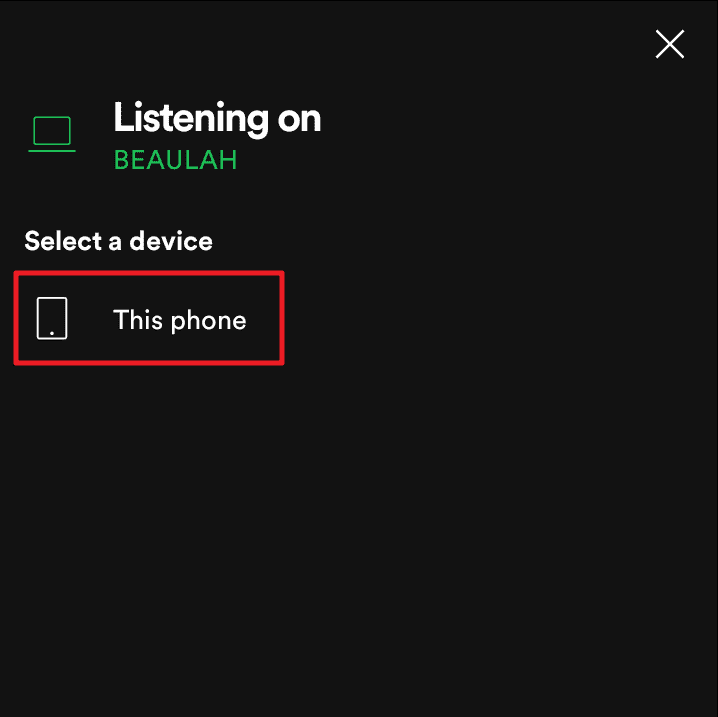 You will now reach the ‘devices’ screen that shows the currently playing and connected device(s). Click the device under the ‘Select a device’ section to switch and make it the currently playing (“listening on”) device.