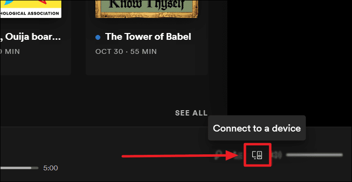 Launch the Spotify application and click the ‘Connect to a device’ button shown with the outlines of two devices to the bottom left corner of the Spotify window.