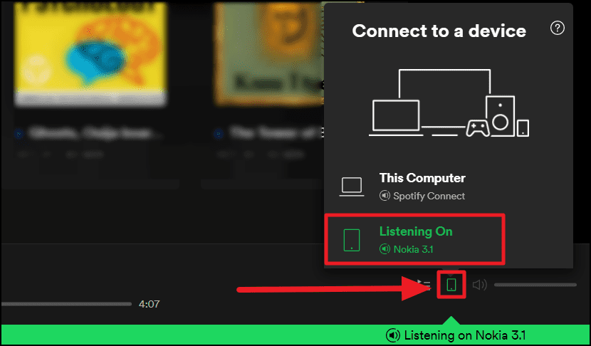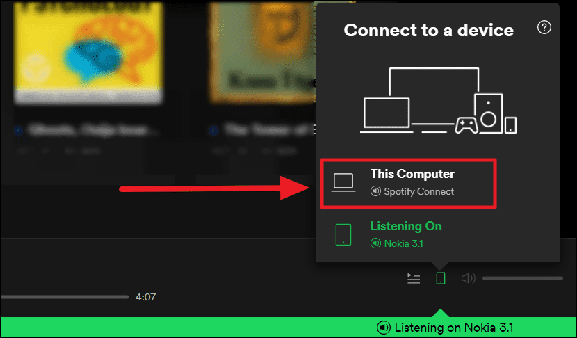 You will see the device that’s currently running Spotify and the list of your other devices right under it. Tap the device you wish to connect, in this case, it’s the computer.