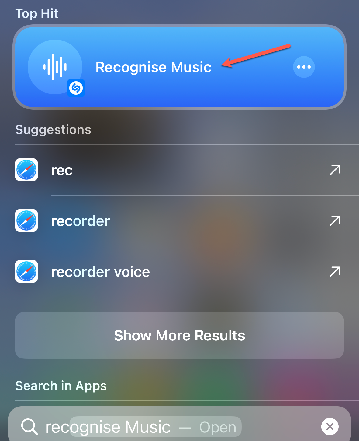 - There are also other shortcuts available in Spotlight now. Searching for Music, for example, also features a shortcut for Music Recognition using Shazam. You can also type "recognize music" to get it even more quickly.