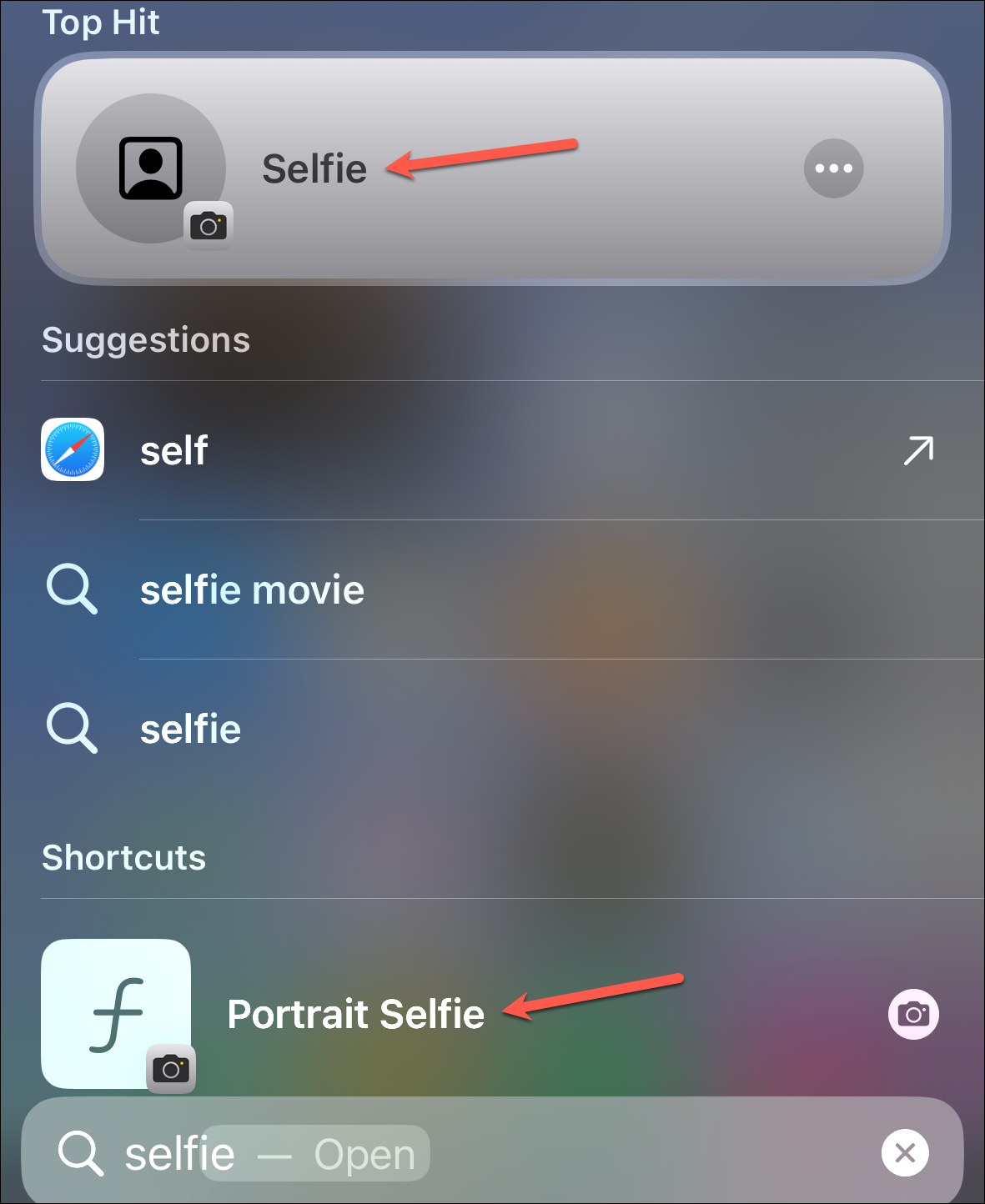 - Here's another example to help you understand this feature better. If you search for "selfie", you'll get Camera app shortcuts for directly opening the 'Selfie' or 'Portrait Selfie' camera.