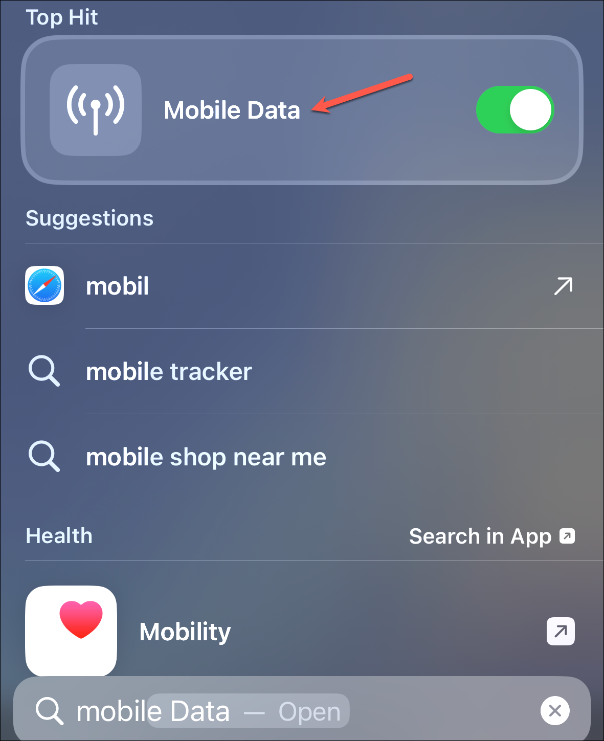 - When you search for the settings app using Spotlight, scroll down a bit, and you'll see a list of popular shortcuts from the app, such as Dark Mode, Airplane Mode, Mobile Data, etc.