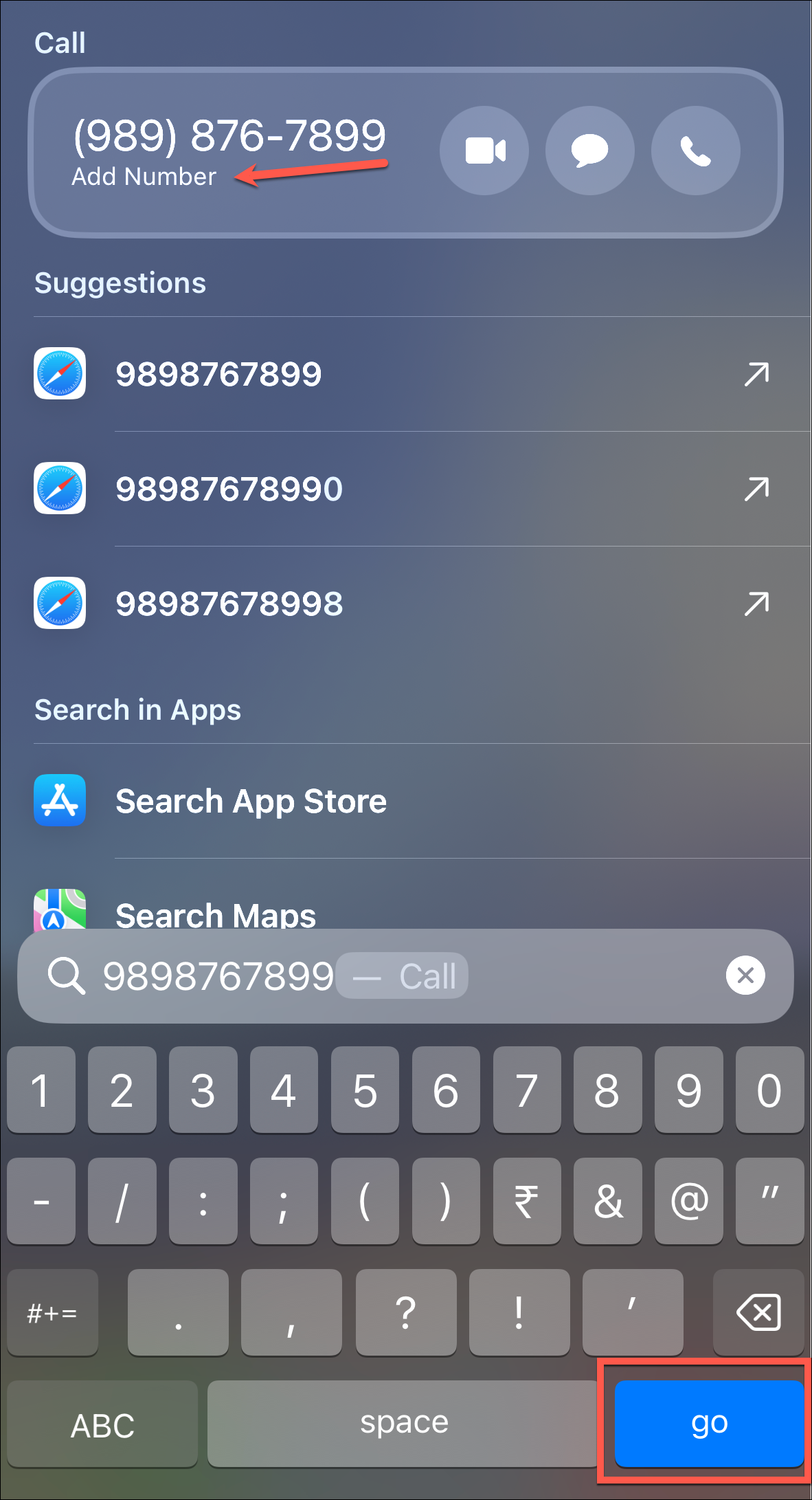 - If you type a phone number in Spotlight instead, you'll get an additional option to 'Add Number' from Spotlight. You can also place the call by tapping 'Go'.