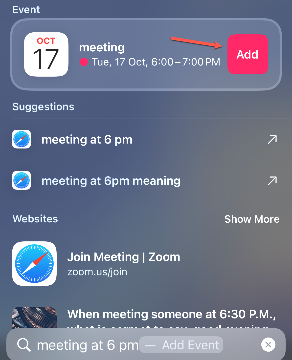 - You can now type 'Meeting at 6 PM' in Spotlight, for example, and you'll get a shortcut to add the event to your calendar on your screen.