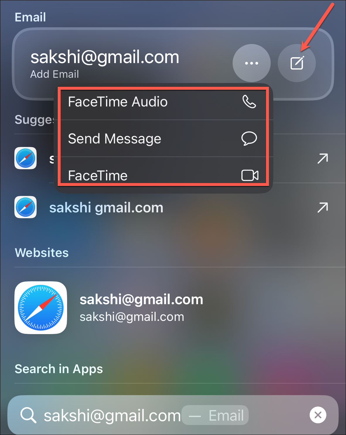 When you type someone's email address, a shortcut to compose an email will appear in Top Hit, along with other options, like adding the email to your contacts, sending a message, or FaceTiming them.