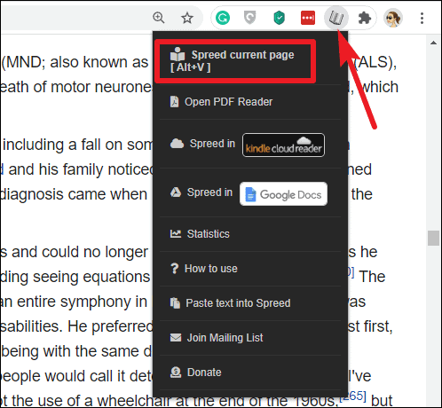 With Spreed installed, you can employ several methods to speed up your reading. Step 1: To speed-read an entire webpage, click on the Spreed extension icon and select 'Spreed current page' from the dropdown menu.
