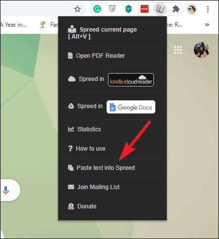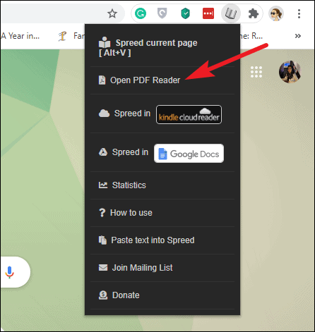 Step 5: If you have a Pro subscription, you can use Spreed's PDF reader to speed-read entire PDF documents. Click on the Spreed extension icon and select 'Open PDF Reader' from the menu.
