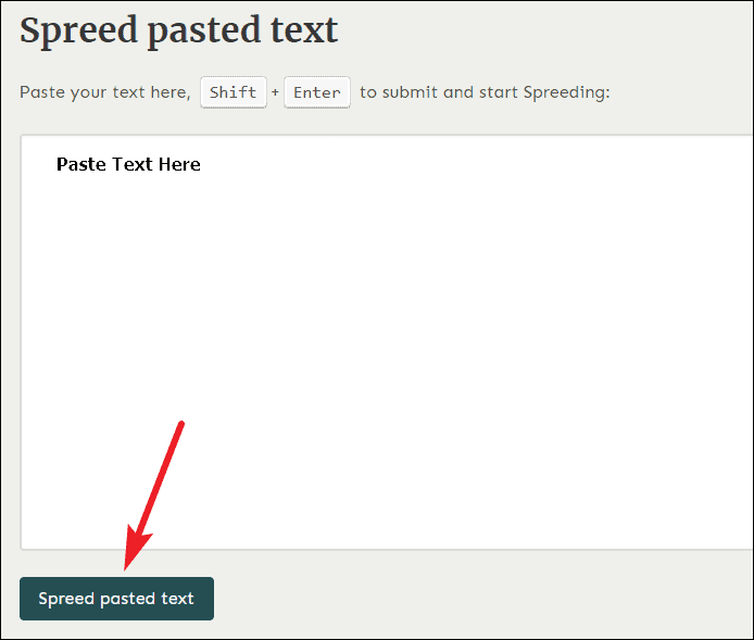 A new Spreed tab will open. Paste the copied text into the textbox and click the 'Spreed Pasted Text' button. You can also start speed-reading the text by pressing Shift + Enter.