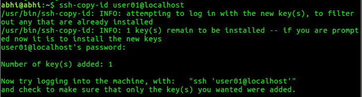 Aim is to copy this generated key to the remote computer. Hence, there has to be one login to the target computer/user to copy this generated key to the remote computer’s SSH config. ssh-copy-id copies the current users’ SSH key to a target computer:
