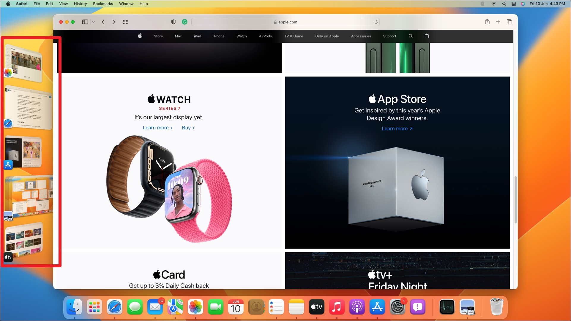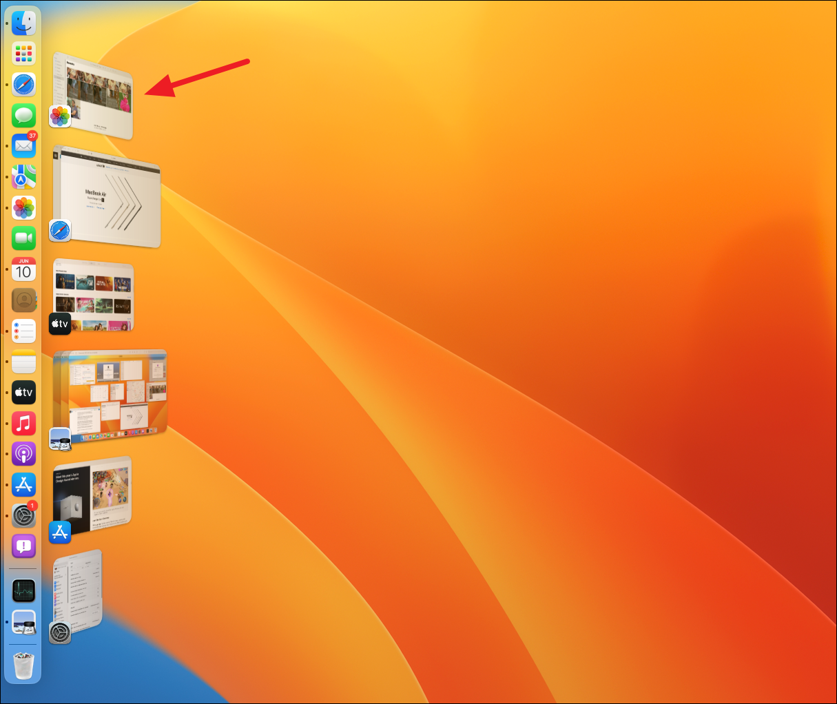 At any given time, the maximum number of thumbnails it shows on the screen is only 5. These prime spots are taken up by apps you were using most recently. So, if you had more apps open, there’s no way to get to them through the Stage Manager. You can open those apps using other means, such as Mission Control.