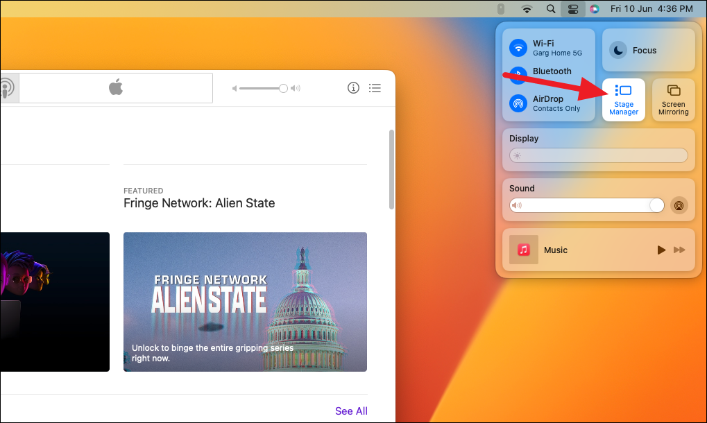 The Control Center will appear on your screen. Click the icon for ‘Stage Manager’ to activate it. It will be highlighted when it’s active.