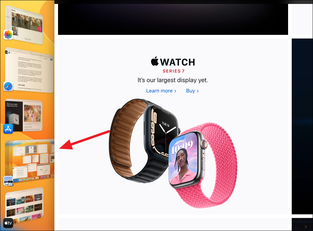 Open any one app that you want to group with other apps. Then, drag the thumbnail for the other app onto the desktop. It’s as simple as that. Keep dragging all the apps you want to include in the group from the left.