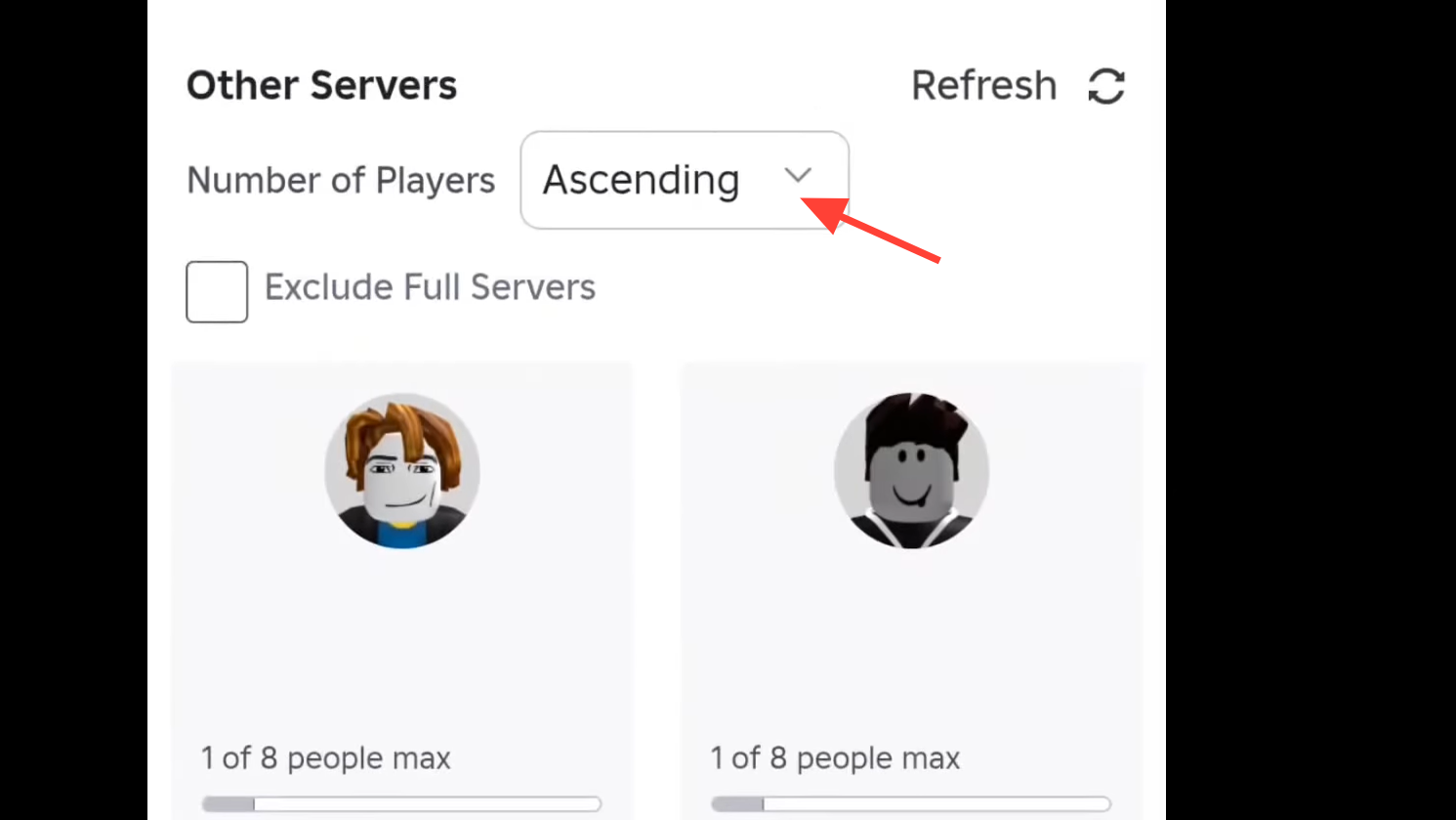 Step 3: Use the sort controls to order servers by player count in ascending order. Also, enable any option that hides full servers.