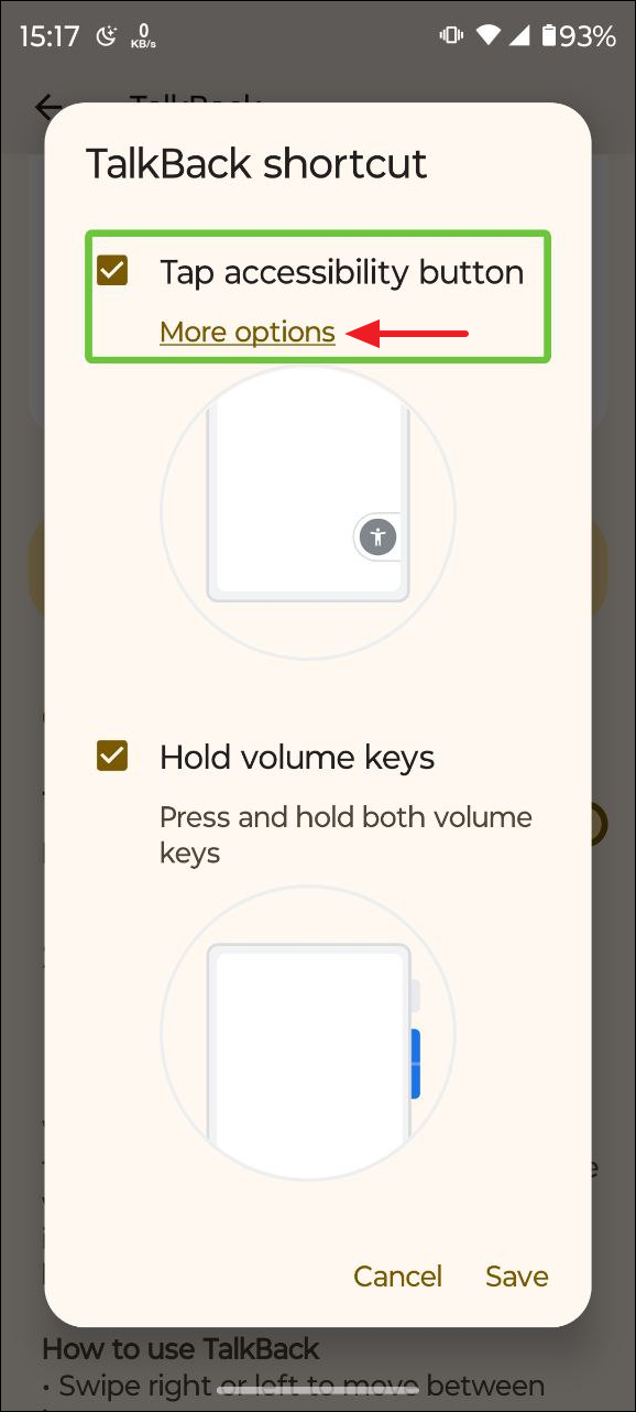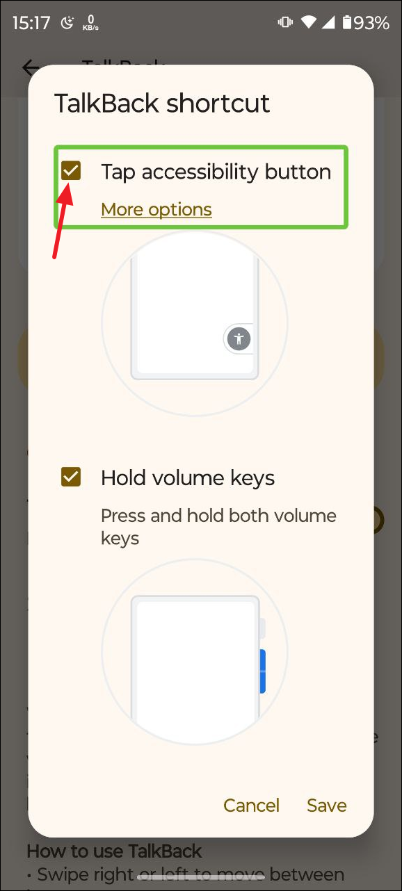 - You can then choose a shortcut to launch TalkBack quickly by tapping on the TalkBack shortcut menu. You can set shortcuts like the volume key and floating accessibility button.