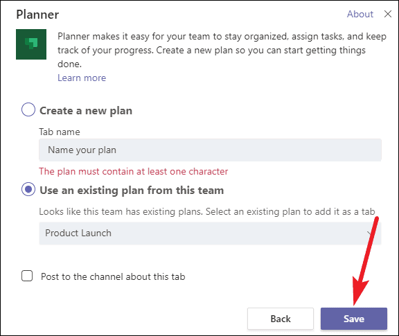 Search for ‘Planner’ from the apps and click on it. You can either create a new plan or add an existing one. Select the radio button corresponding to the option you want, and then either enter the name for a plan (to create a new plan) or select an existing plan from the drop-down menu. Then, click the ‘Save’ option.