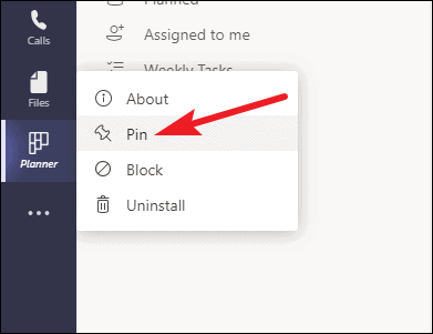 The Planner (or, Tasks by Planner and To Do, in some cases) will appear on the navigation bar. You can also pin the app on the navigation bar for future access. Right-click on the app and select ‘Pin’ from the options menu.