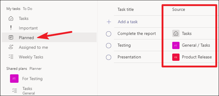 The Planned category shows all your tasks that have a Due Date, from To Do as well as Planner that are assigned to you, sorted by date so you can keep track of your time table. It also shows tasks from Plans that are not part of your Teams but are present in the native Planner app.