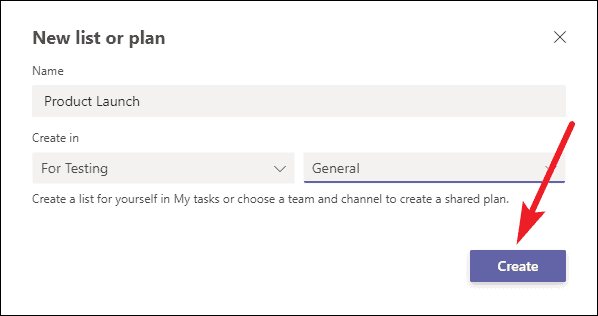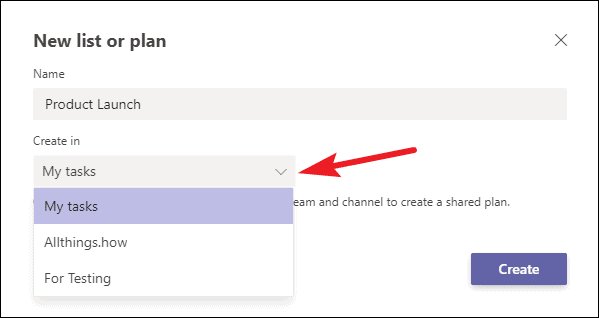 The window to create a new task will appear. Give your list or plan a title. Then, go to the drop-down menu under ‘Create in’ and select what type of task is it going to be. Select ‘My Tasks’ if you want to create a private list or the team name, and channel if you want to create a shared plan.