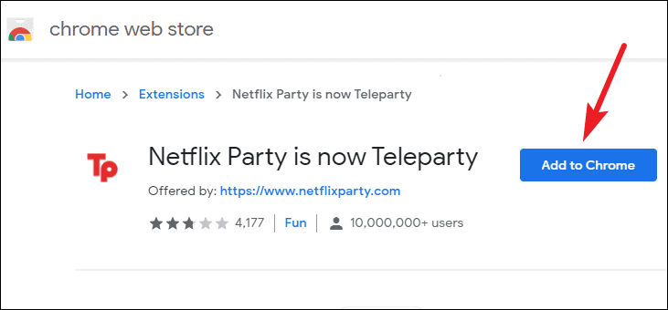 The page for ‘Netflix Party is now Teleparty’ will open. Click the ‘Add to Chrome’ button on the right side of the page.