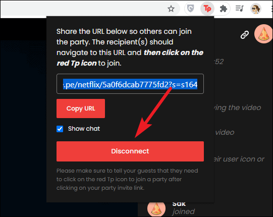 To end the watch party session, click the extension icon, and click the ‘Disconnect’ button from the menu.