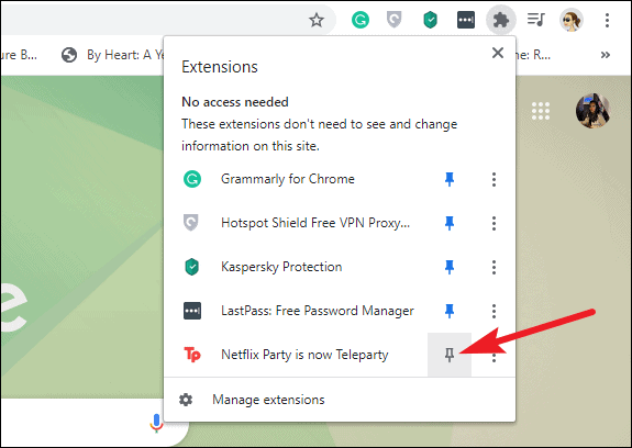 Then, click the ‘Pin’ icon next to the ‘Netflix Party is now Teleparty’ option to pin the Teleparty extension to the address bar to make it more accessible.