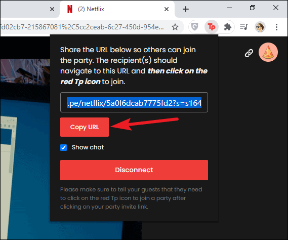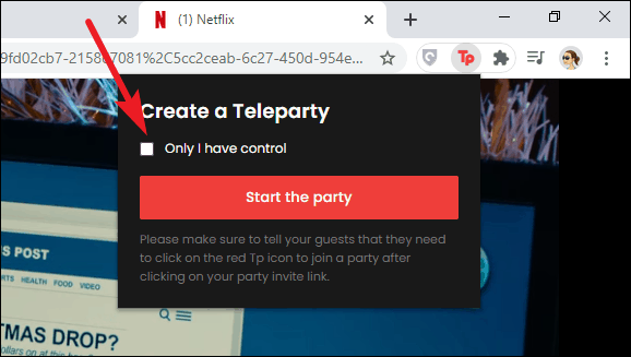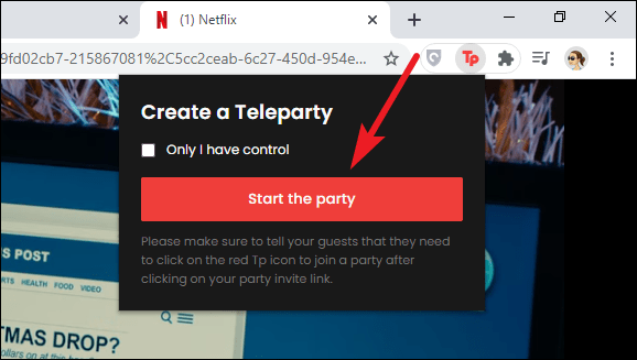 Open one of the supported streaming websites on your browser, and play the video (movie/ show) you want to watch together. Then, click the red ‘TP’ icon on the address bar.