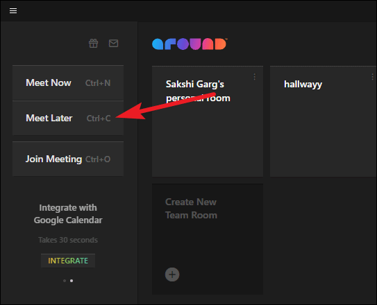 You can also have meetings outside the room at a later time. Meet later is useful when you want to share the meeting link with someone right now but want to have the meeting later but also not in any of the rooms. Click the ‘Meet Later’ button on the left panel. Around will create a one-time meeting link which you can share right now but use later. Copy the meeting link and share it with others. You’ll also need the meeting link to join that meeting yourself.