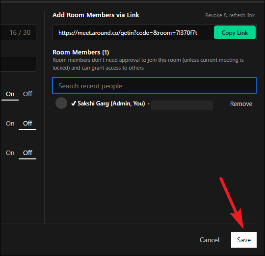 Add members you want to give access to the room. Either copy the link and share it with them or type their names and see if they pop up in suggestions. Click their name to add them. Invited members have to join the room from their end after being added. Finally, click the ‘Save’ button.