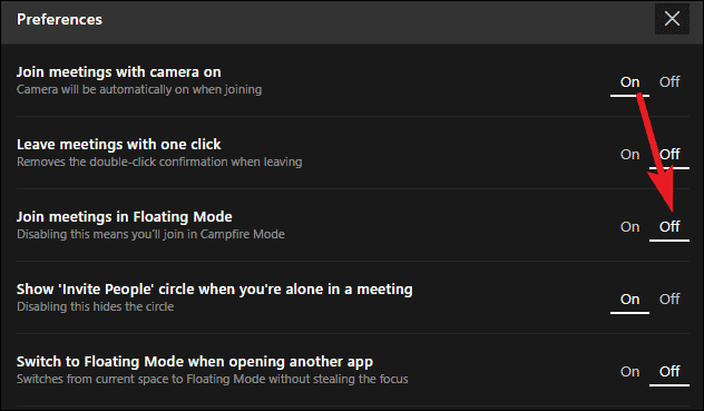 Go to your floating video and a window will appear around it. Click the option for ‘Campfire mode’ to switch modes. Switching a mode only affects your view and not other members in the meeting.