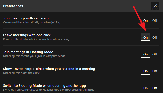 You can change the settings to leave the meeting with a single click. Open ‘Preferences’ from the Around lobby. Then, select ‘On’ for ‘Leave meeting in a single click’.