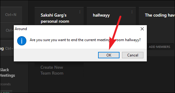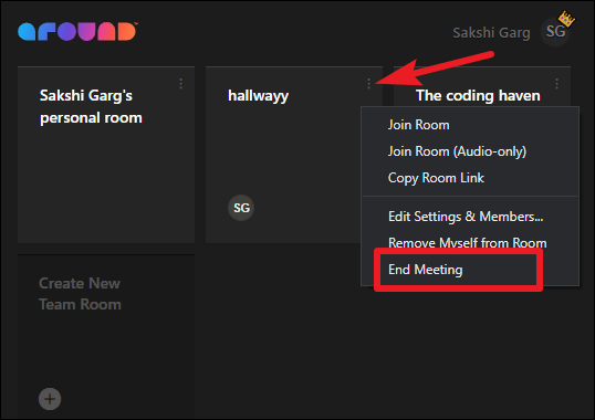 Around does not have an option to end the meeting for everyone from within the meeting. If you leave the video with other participants still in it, they can continue to meet. To end the meeting for everyone, go to the Room thumbnail in the Around lobby and click the three-dot menu. Then, click ‘End meeting’.