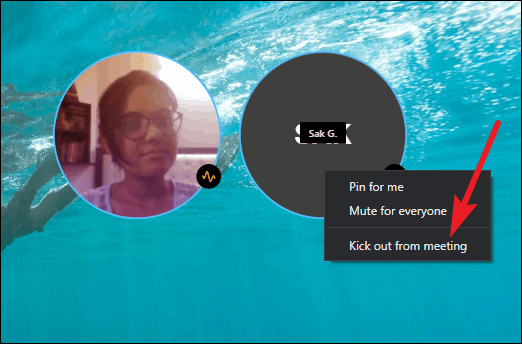 You can also kick others out before leaving the meeting or during the meeting if someone’s causing trouble. Right-click on their video bubble and select ‘Kick out from meeting’ from the menu.