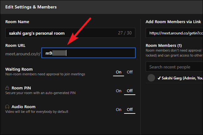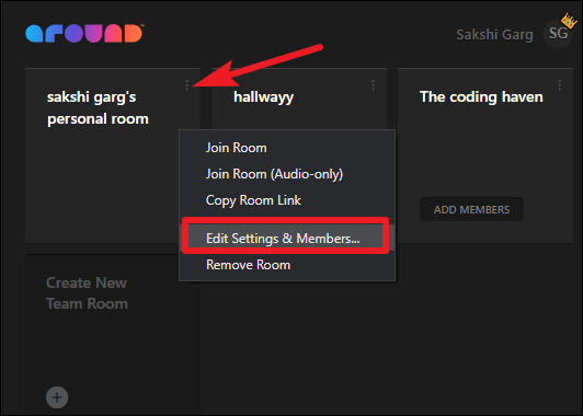 By default, Around will create a link for your personal room. But you can edit it. Click the ‘More options’ icon (three-dot menu) on the upper-right corner of the room thumbnail and select ‘Edit settings and members’ from the menu.