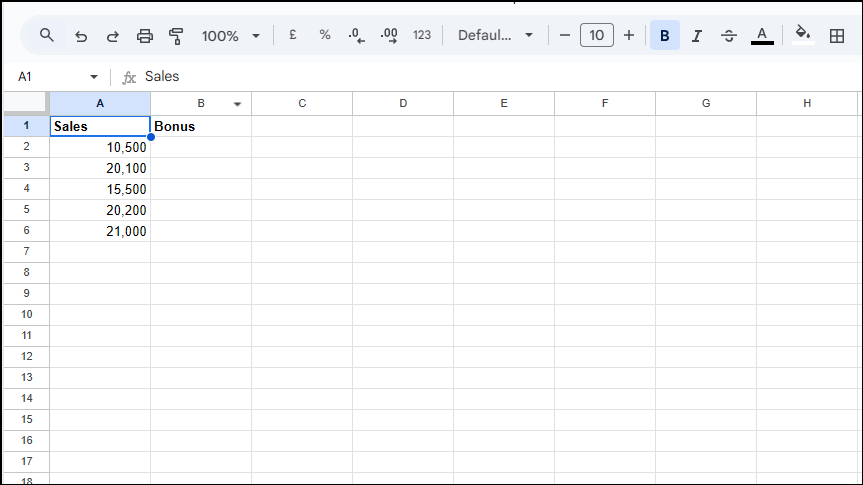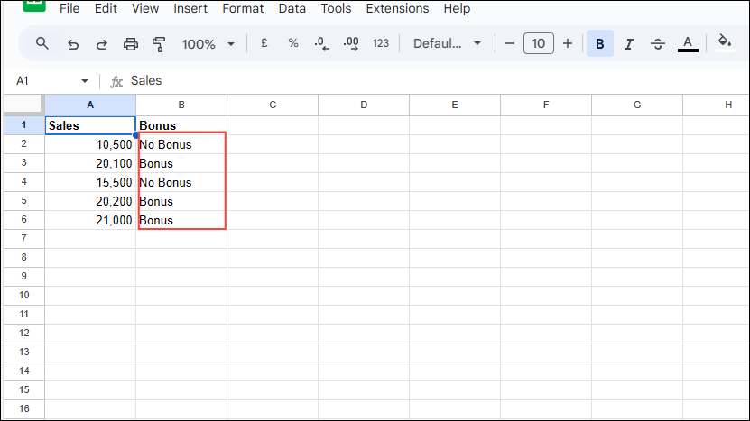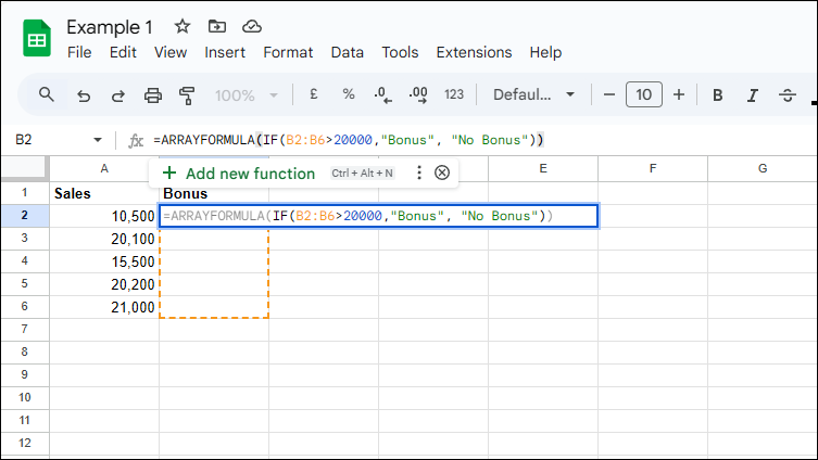 =ARRAYFORMULA(IF(B2:B6>20000,"Bonus", "No Bonus")). This will generate the output for the entire range.