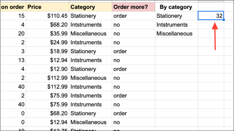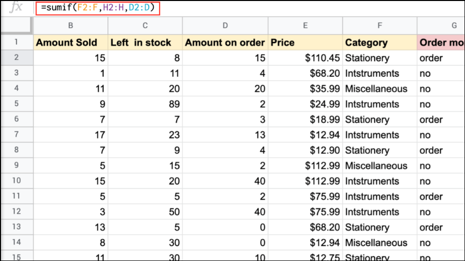 - In this example, we need to find out the number of stationery items ordered using the SUMIF function. The formula will be