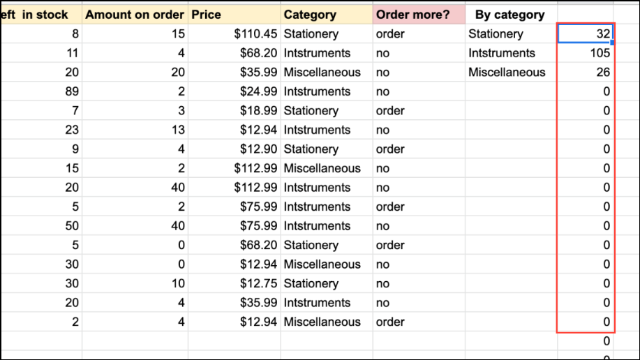 - Now, you can use the Array Formula to determine the number of items ordered for every category using